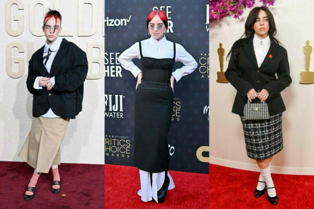 Billie Eilish iconic look at 2024 Academy Award can be one of the most recognisable looks. Her ‘School Girl’ look is easy to follow, a playful and edgy twist, pair a houndstooth-print mini skirt with a baggy graphic tee or sweatshirt. Don’t forget the chunky socks and patent leather Mary Jane pumps for that classic schoolgirl vibe. Accessorize with statement necklaces, bracelets, and bold rings. And of course, no Billie Eilish costume is complete without her signature hairstyle.